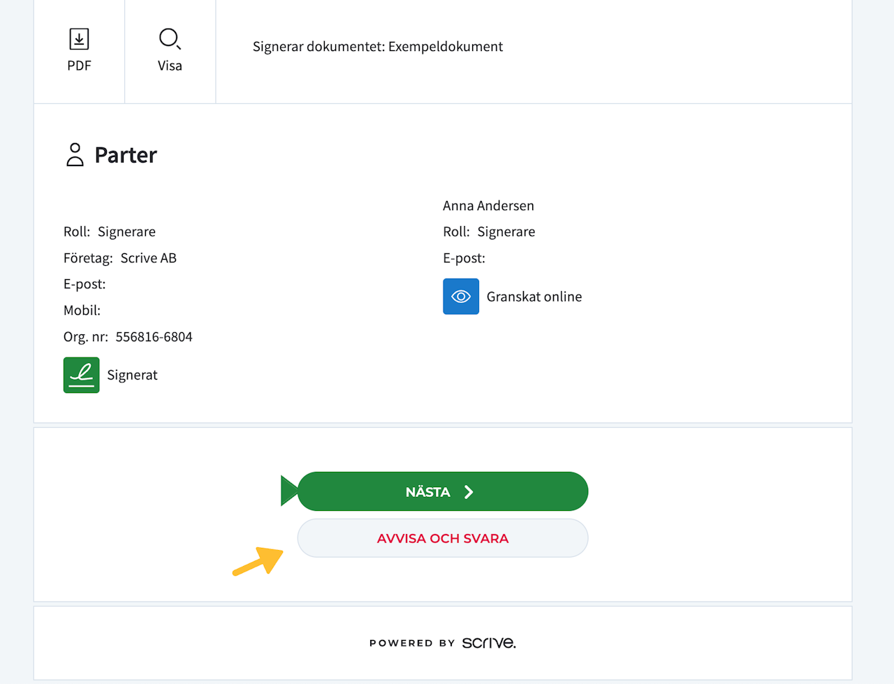 Genom att visa en avvisningsknapp tillåter du inbjudna parter med rollen signerare eller godkännare att avvisa signeringen eller godkännandet av dokumentet.
