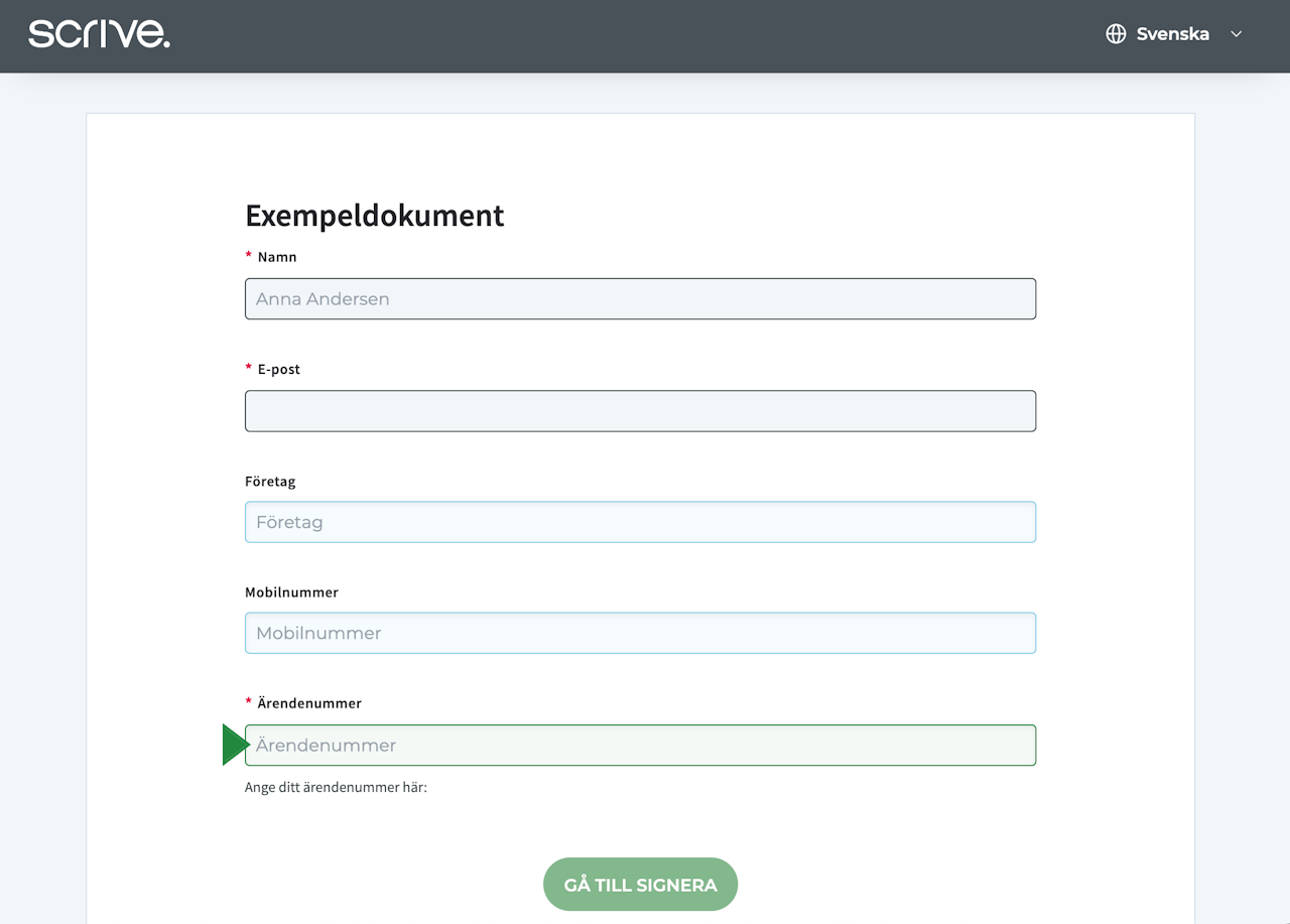 När inställningen "Aktivera formulär" är aktiverad, kommer ett formulär att presenteras för den signerande parten vid signering. Detta formulär låter dem ange all nödvändig information kopplad till tillagda fält i dokumentet på en och samma gång—innan de går vidare för att granska och signera själva dokumentet.