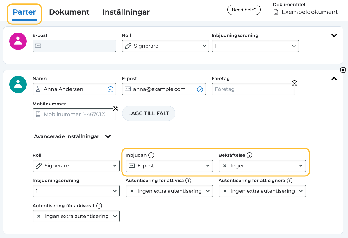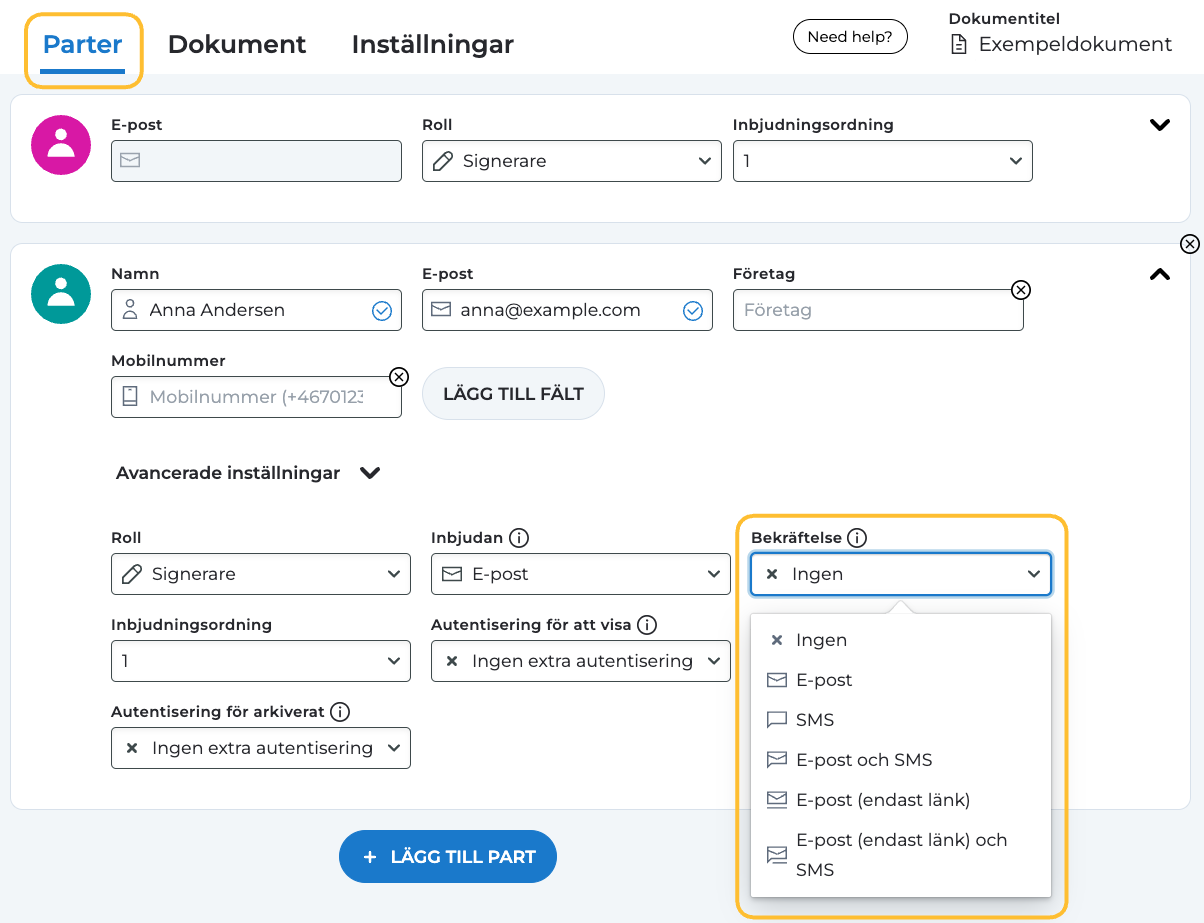 När du bjuder in parter att granska, signera eller godkänna ett dokument, har du möjlighet att välja hur de ska notifieras och även bestämma hur och om en bekräftelse ska skickas ut efter att dokumentet har signerats av alla parter. Dessa inställningar finns under fliken "Parter" när du ställer in ditt dokument för signering.