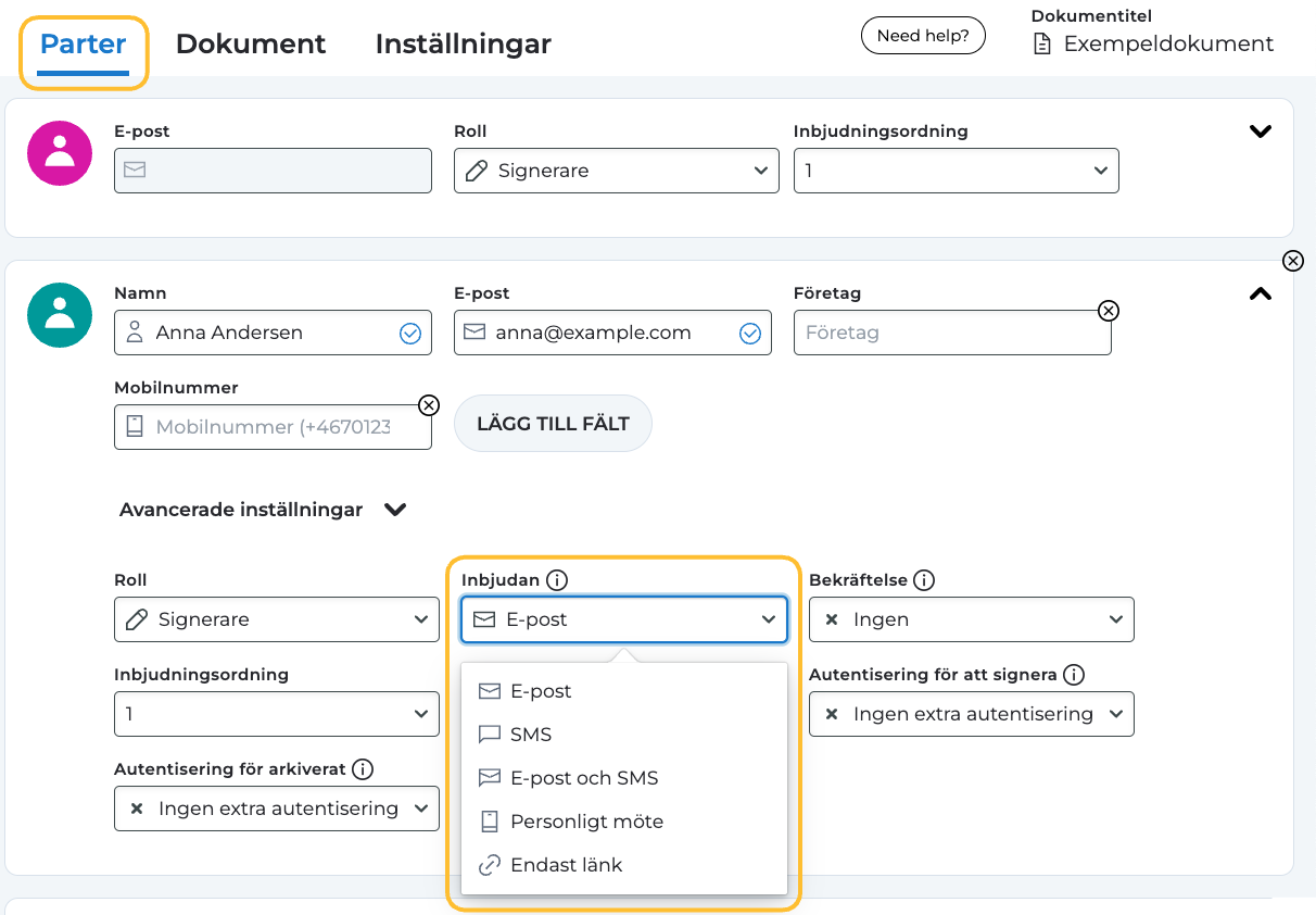 E-post och SMS: En inbjudan skickas automatiskt till både partens e-postadress och mobilnummer, inklusive en länk till dokumentet.