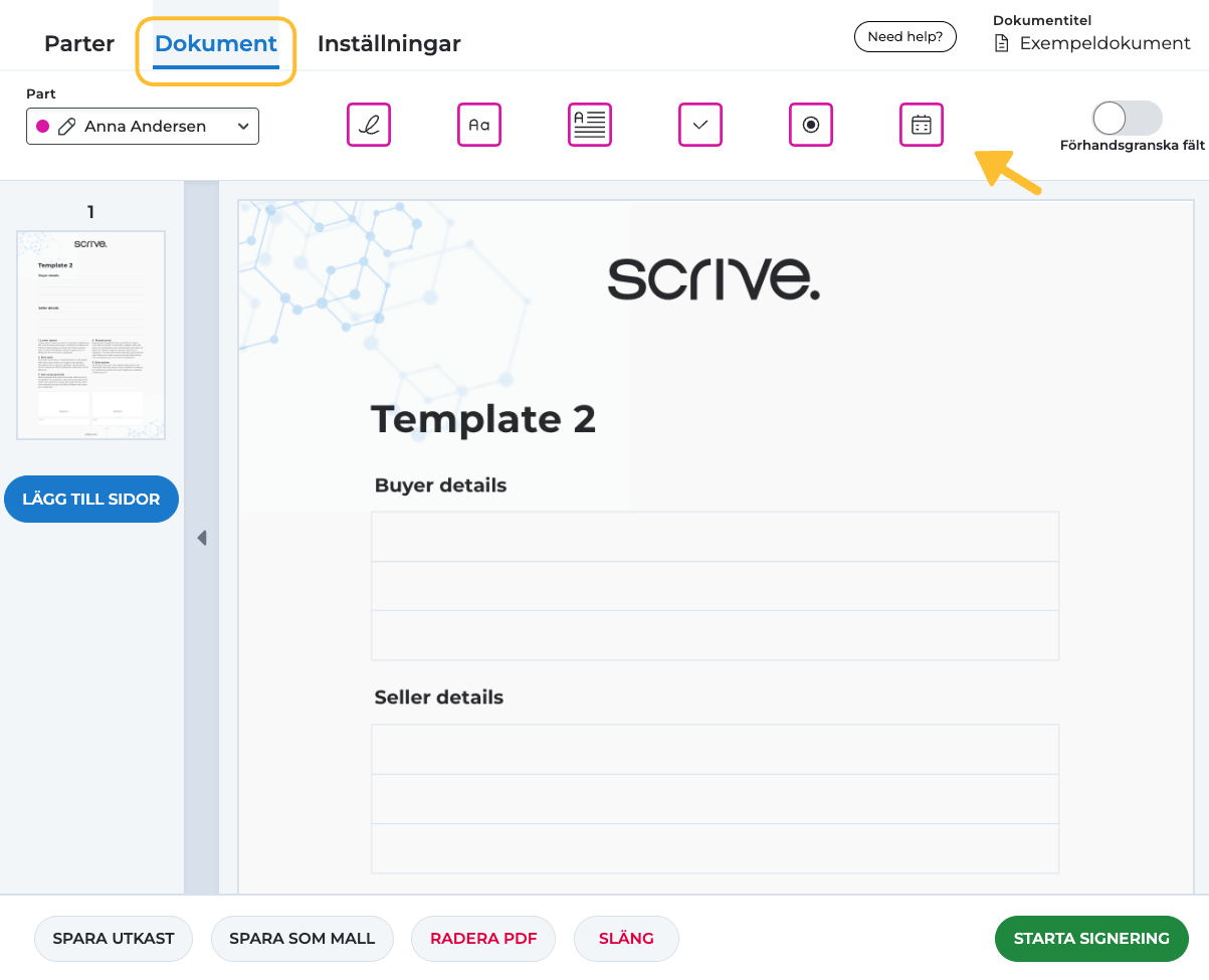 När du har laddat upp ditt PDF-dokument har du möjlighet att förbättra det genom att lägga till fält. Fält tjänar två huvudsakliga syften: de kan samla in information från undertecknande parter och de kan också lägga till extra detaljer till ditt dokument. Du är fri att lägga till så många fält du behöver.