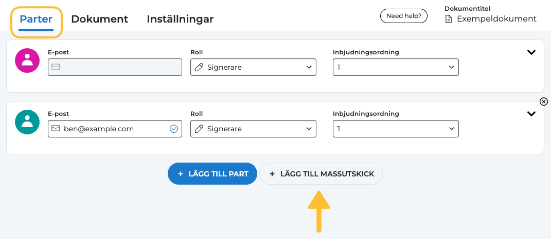 Alla parter som läggs till för massutskicket kommer att få ett identiskt dokument med samma inställningar. För optimal prestanda rekommenderas det att begränsa din mottagarlista till cirka 300 personer. Om du behöver skicka ditt dokument till fler än 300 personer, föreslår vi att du delar upp processen i flera omgångar.