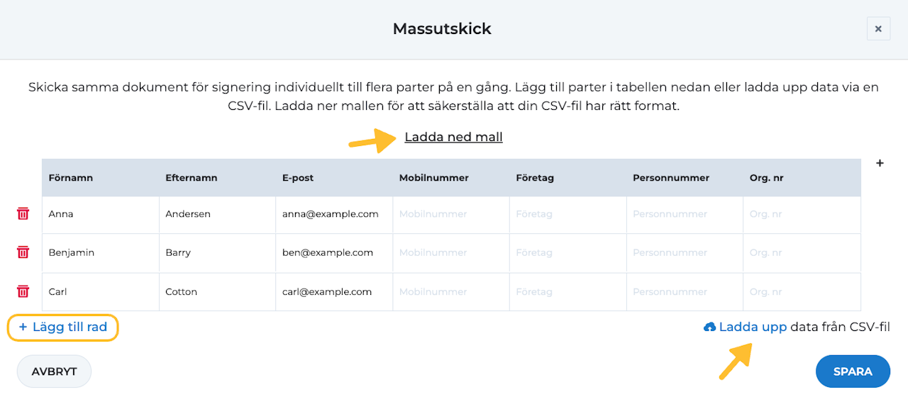 Du har möjlighet att ange detaljer för alla mottagare genom inställningarna för massutskicket, eller så kan du ladda upp en förberedd CSV-fil. För att förenkla dina förberedelser kan du också ladda ner en CSV-mall som redan innehåller rätt format.