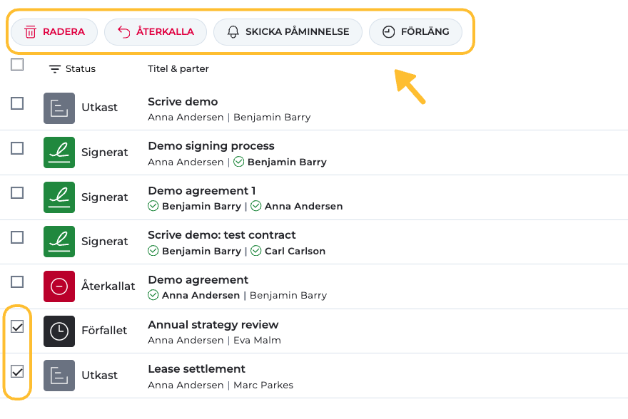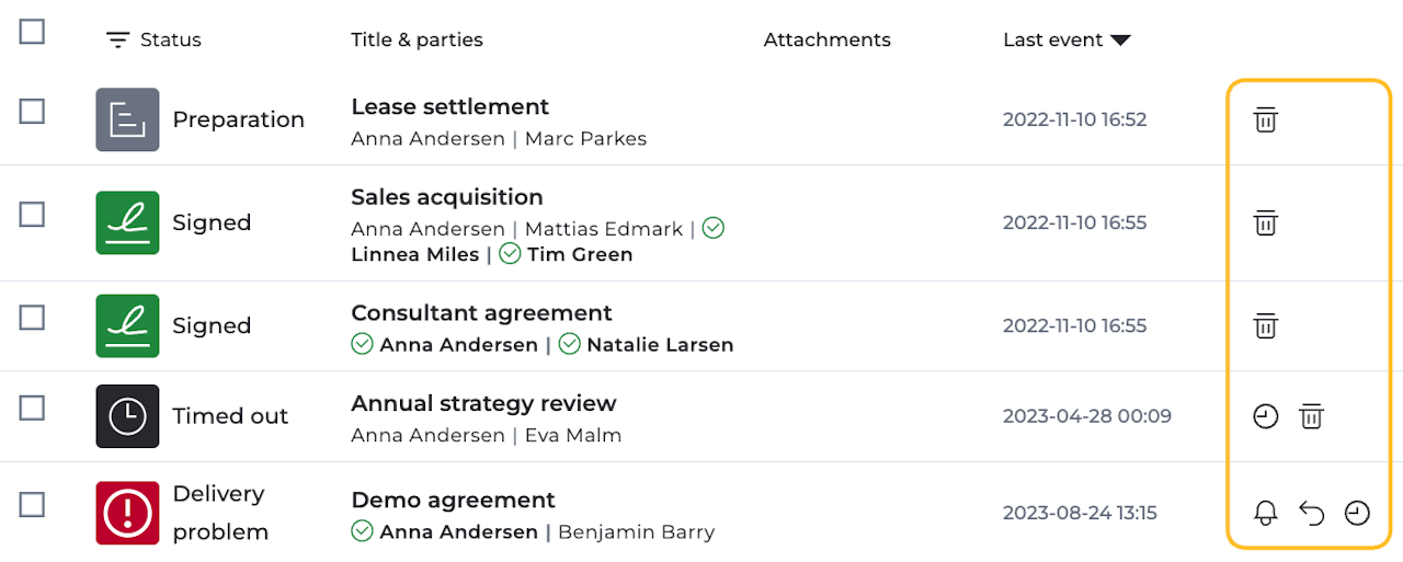 De tillgängliga åtgärderna beror på dokumentets status och gör det möjligt för dig att snabbt radera, skicka påminnelser, återkalla eller förlänga processens förfallodatum.