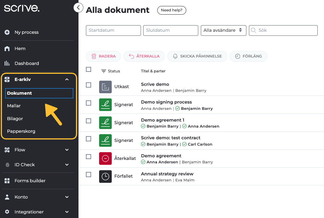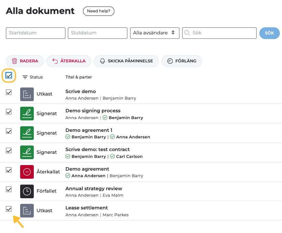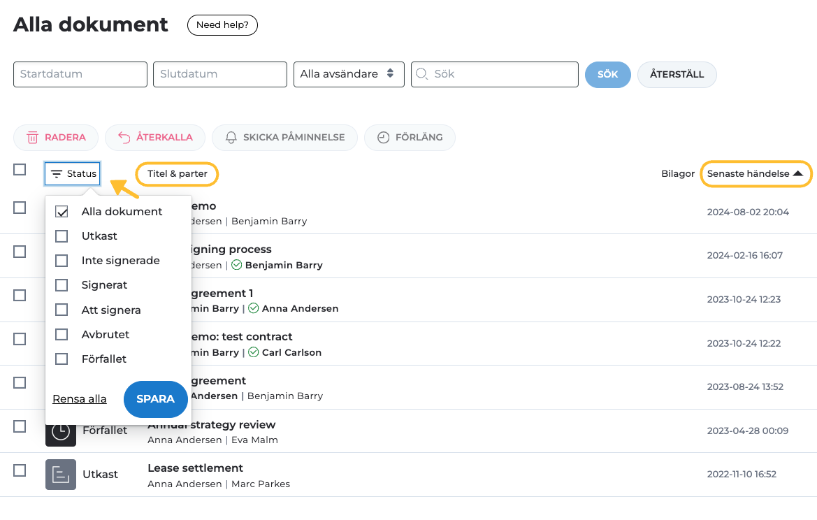 Du kan också förfina din sökning genom att filtrera dokument efter status: utkast, inte signerade dokument, signerade dokument, dokument som väntar på din signatur, avbrutna processer och förfallna dokument.