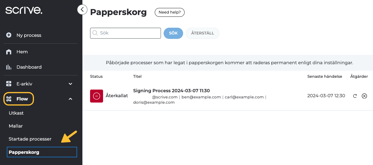 Alla raderade dokument och processer flyttas först till papperskorgen under "Flow" via huvudmenyn. Observera att det finns ett separat papperskorgsarkiv för Flow-processer och för standarddokument i eSign Online. Om en fil ligger kvar i papperskorgen i 30 dagar kommer den att raderas permanent, såvida inte andra inställningar för datalagring är konfigurerade.