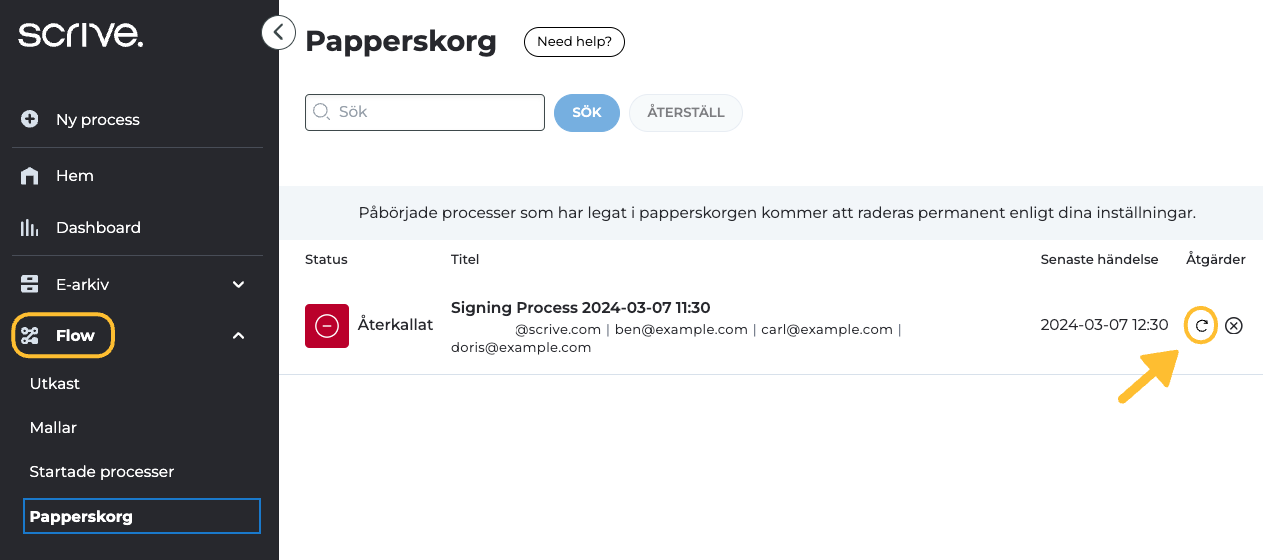 För att återställa en process från din papperskorg i Flow, klicka på återställningsikonen bredvid dokumentets titel. Processen kommer automatiskt att flyttas tillbaka till din lista över startade processer.