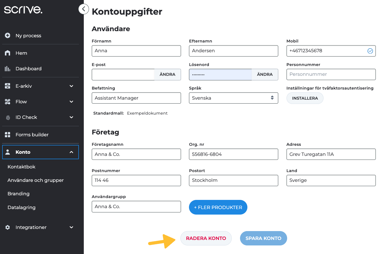 Om du har varit en ensam användare kommer alla dina dokument att tas bort tillsammans med ditt konto vid borttagningen. Om du har varit en del av en användargrupp (till exempel inom ett företag med dina kollegor), kommer dina dokument fortfarande att vara tillgängliga inom användargruppens E-arkiv och kan nås av gruppens Admin-användare.