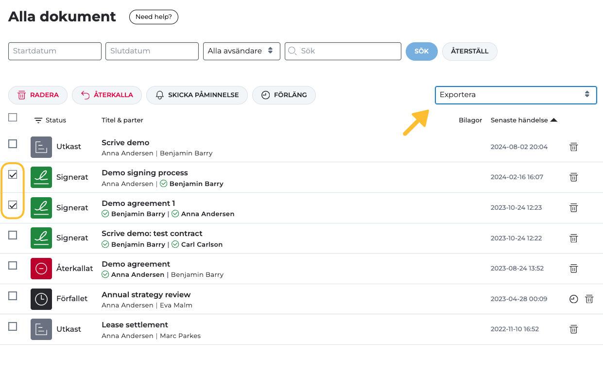 Välj de dokument du vill exportera från listan.